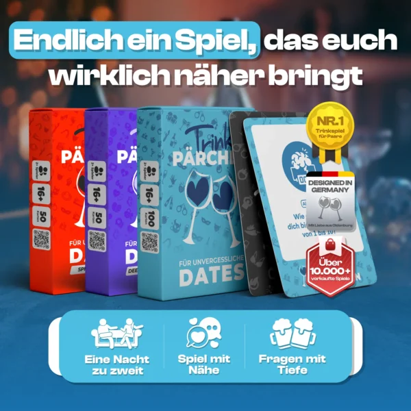 Sind die Fragen zu intim, wenn man sich noch nicht lange kennt? Perfekt durchdacht! Das Hauptspiel startet locker und harmlos. Ihr entscheidet selbst, ob und wann ihr zu Spicy oder Deep wechselt. Niemand muss sich unwohl fühlen – garantiert!